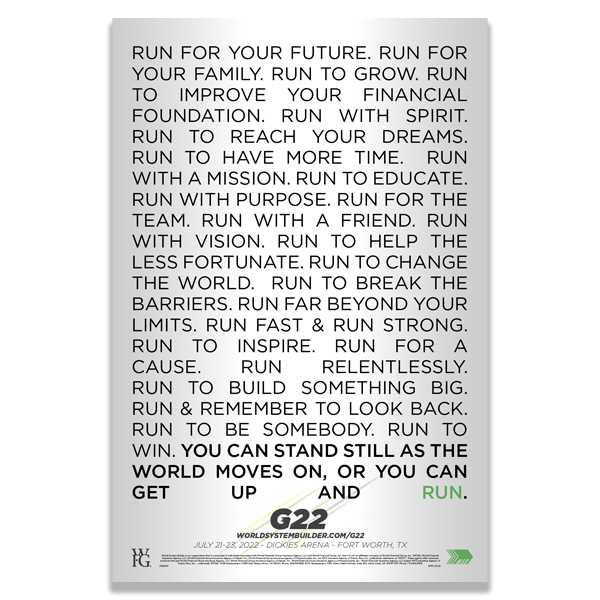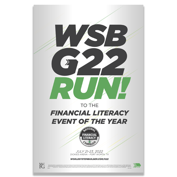*From April 4, 2022, to July 23, 2022, World System Builder will donate $3 for every registration ticket for the WSB G22: Run event to the International Rescue Committee, a not-for-profit organization dedicated to providing humanitarian aid, relief and resettlement to refugees and other victims of oppression or violent conflict, $3 to The WFG Foundation, an independent, nonprofit organization dedicated to improving the quality of people’s lives in the communities where our U.S. licensed agents work and live, and $4 to charity: water, a not-for-profit organization dedicated to providing clean water to people in developing countries. For more information, visit www.rescue.org, https://www.worldfinancialgroup.com/community-impact, and www.charitywater.org/wsb. No portions of the purchase price are tax-deductible.